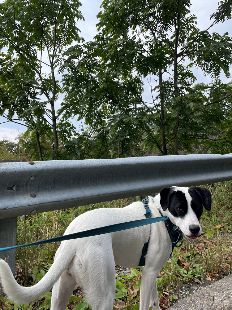 a white and black dog standing in front of a guard rail with a tree of heaven in the background